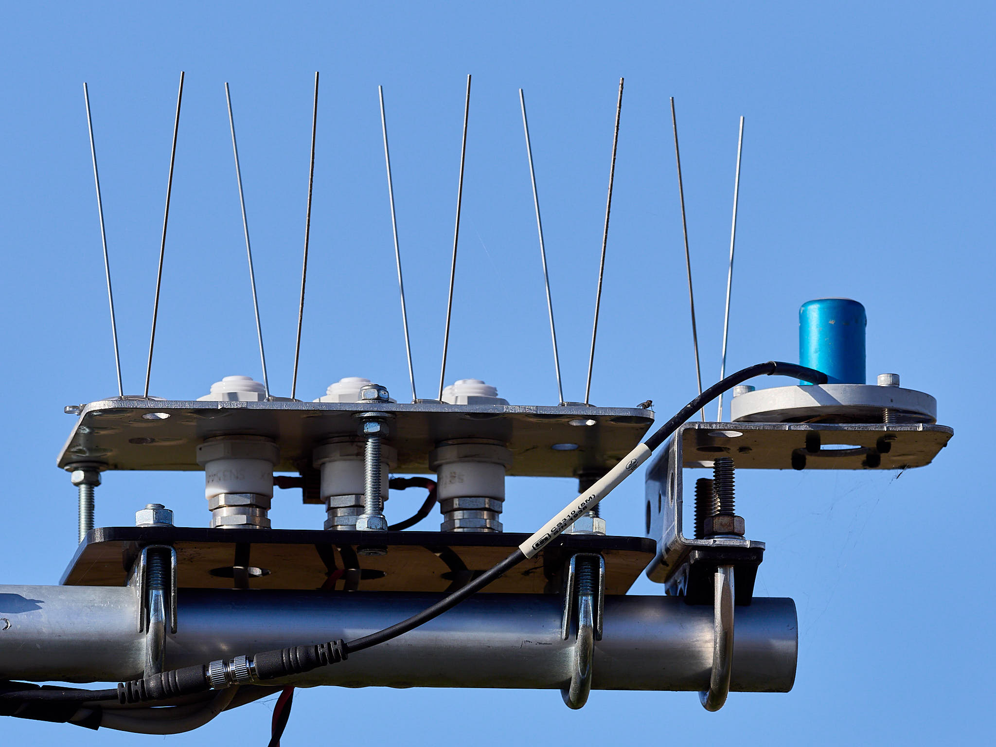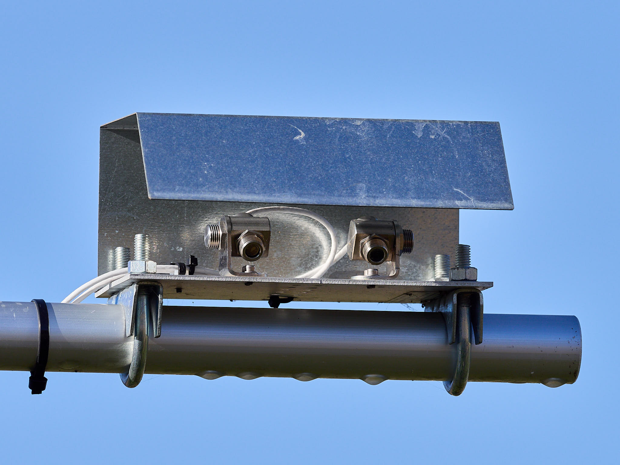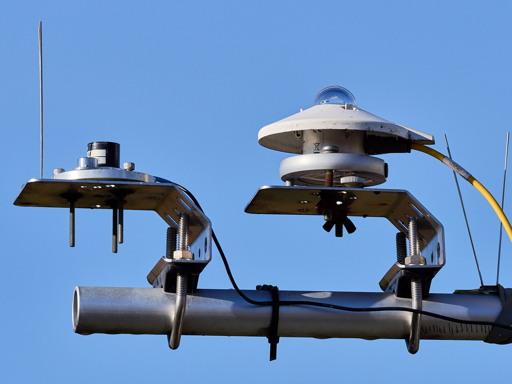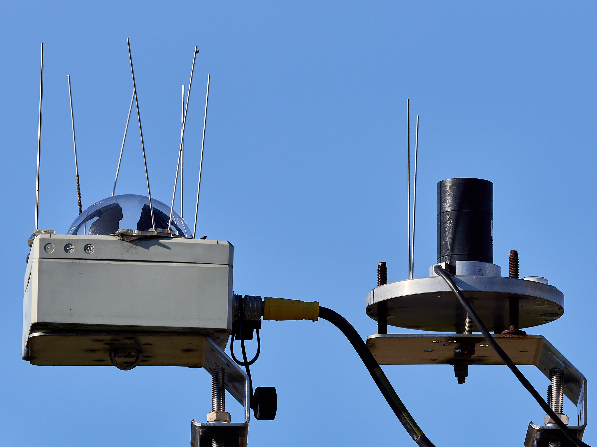 Radiation sensors are at \(> 2\,\)m above the ground surface, on a cross arm on the South of the tower, except for the sglux ones that are on the North side at the opposite end of the same cross arm. The weather sensor is at \(1.9\,\)m above the ground, at the East end of an East-West cross arm \(0.75\,\)m away from the mast. The sensors were relocated in the Spring of 2020, moving the radiation sensors higher up and the weather sensor from the North to the East side of the mast. The station is powered by a battery that is charged by a mains power supply and a solar panel in parallel, ensuring uninterrupted power year-round in spite of the high frequency of measurements, and the heating of some of the sensors during winter time. The table below lists the sensors, acquisition and logging frequencies, commissioning and decommissioning dates.